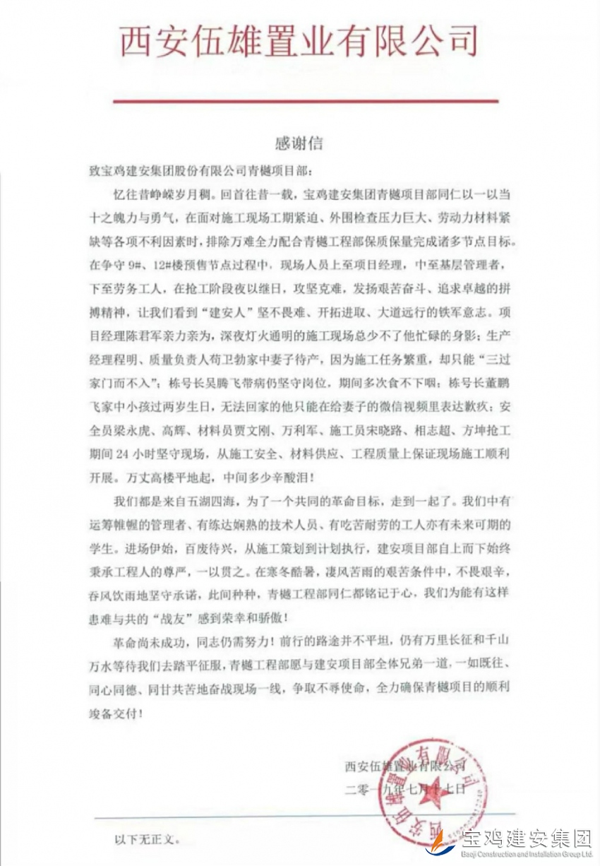 2019年7月17日,我公司路橋項(xiàng)目部承建的中南青樾項(xiàng)目收到由建設(shè)單位西安伍雄置業(yè)有限公司發(fā)出的一封感謝信,信中言辭懇切,對(duì)路橋公司青樾項(xiàng)目管理人員給出了極高的評(píng)價(jià)。在面對(duì)施工現(xiàn)場工期緊迫、資金短缺、外圍檢查壓力巨大、勞動(dòng)力材料緊缺等各項(xiàng)不利因素時(shí),寶雞建安集團(tuán)青樾項(xiàng)目部各位同仁克服自身困難、艱苦奮斗、不畏艱難以一當(dāng)十之魄力與勇氣保質(zhì)保量并按工期節(jié)點(diǎn)完成了施工任務(wù)。