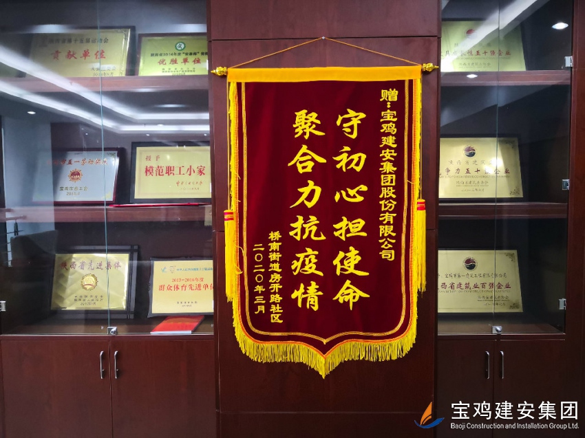 4月1日上午,寶雞建安大廈21樓舉行了一場簡單而熱烈的贈旗活動。橋南街道辦事處房開路社區(qū)馮書記、王主任等三人代表社區(qū)所管轄的廣大居民,給寶雞建安集團股份有限公司送來一面“守初心擔使命、聚合力抗疫情”的錦旗,贊揚寶雞建安集團公司在新冠肺炎疫情防控工作中對社區(qū)工作的支持和幫助。公司黨委書記、總經理、工會主席等參加活動。