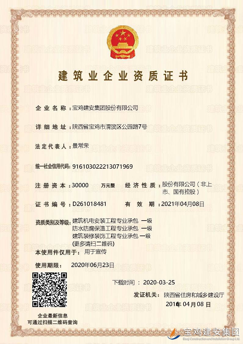近日,公司資質工作再傳捷報,經陜西省住房和城鄉建設廳等主管部門核準,公司申報的環保工程專業承包一級資質、電力工程施工總承包二級資質成功獲批。