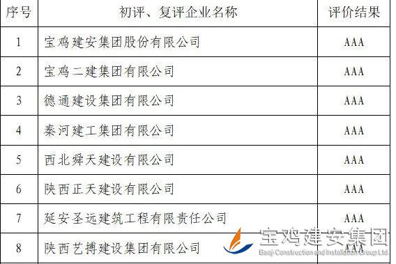 按照統一安排部署,省建協于2022年11月19日組織評審專家一行蒞臨建安集團,現場面對面審驗資料,并深入明星村棚戶區改造三期地塊一項目1#-2#商住樓及地下車庫項目進行實地訪談,隨后協會又于2023年1月11日正式發文進行為期7天的公示,最終,我公司順利通過復審,再次躋身陜西省建筑施工企業信用評級AAA級企業行列。