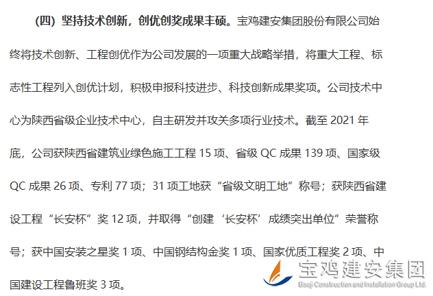 通報文件第二部分對參評企業特色及亮點進行了點名評述,其中第四版塊“堅持技術創新,創優創獎成果豐碩”一欄,對我司進行了專門評介:“寶雞建安集團股份有限公司始終將技術創新、工程創優作為公司發展的一項重大戰略舉措,將重大工程、標志性工程列入創優計劃,積極申報科技進步、科技創新成果獎項。公司技術中心為陜西省級企業技術中心,自主研發并攻關多項行業技術。截至2021年底,公司獲陜西省建筑業綠色施工工程15項、省級QC成果139項、國家級QC成果26項、專利77項;31項工地獲“省級文明工地”稱號;獲陜西省建設工程“長安杯”獎12項,并取得“創建‘長安杯’成績突出單位”榮譽稱號;獲中國安裝之星獎1項、中國鋼結構金獎1項、國家優質工程獎2項、中國建設工程魯班獎3項。”