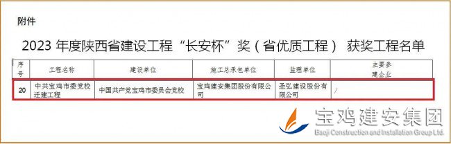 近日,陜西省住房和城鄉(xiāng)建設廳《關于公布2023年度陜西省建設工程長安杯獎(省優(yōu)質工程)評選結果的通知》正式下發(fā),公司承建的中共寶雞市委黨校遷建工程榮登金榜,為集團再添一項陜西省建設工程“長安杯”獎。